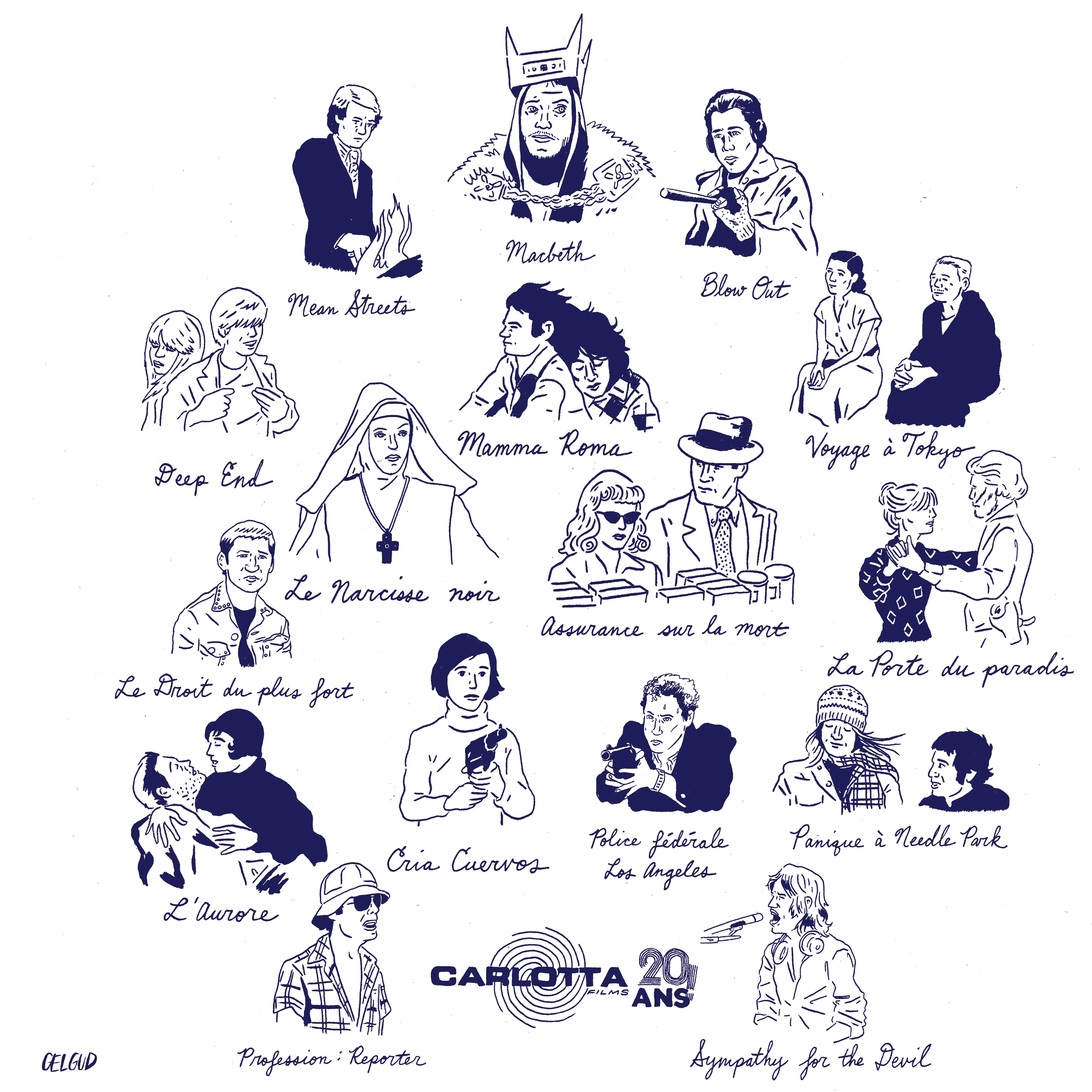 Illustrateur et cartoonist installé à Los Angeles, Nathan Gelgud s’est fait connaître des cinéphiles du monde entier à travers ses sacs en tissu en hommage à ses réalisateurs fétiches. Après Godard ou Jarmusch, il s’est emparé des sorties les plus iconiques de Carlotta Films avec la création de ce sac exclusif.
